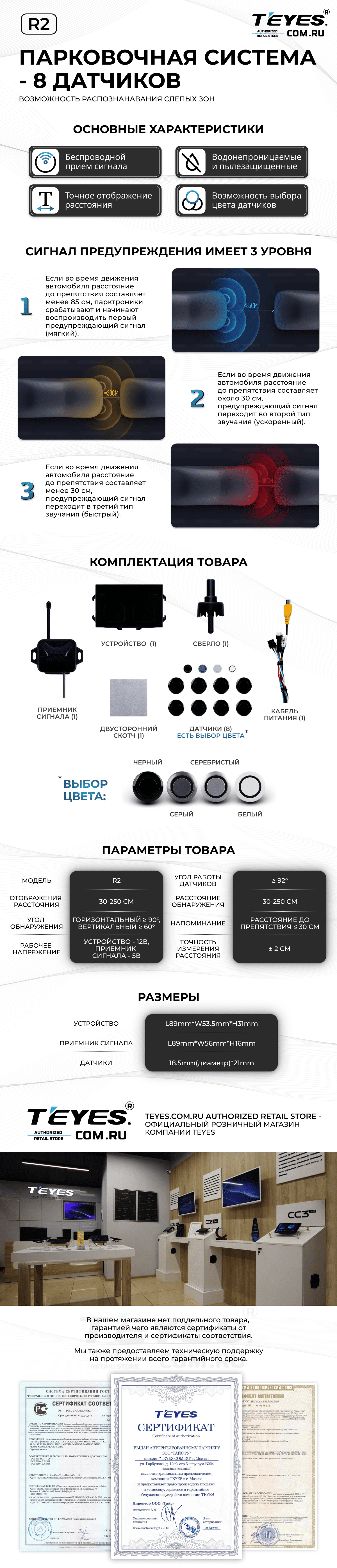 Передние и задние парктроники Teyes R2 для CC4 Pro / CC4 / CC4L / CC3 2K / CC3 / CC3L / CC2 Plus / SPRO Plus / TPRO2 / LUX ONE (Серебристые) 8-датчиков - купить всего за 19 900 руб. в интернет-магазине в Калининграде Teyes.com.ru. ✓ Самый лучший выбор мультимедиа ✓ Лучшая замена штатному ГУ ✓ Тел. +7 (800) 775-31-74