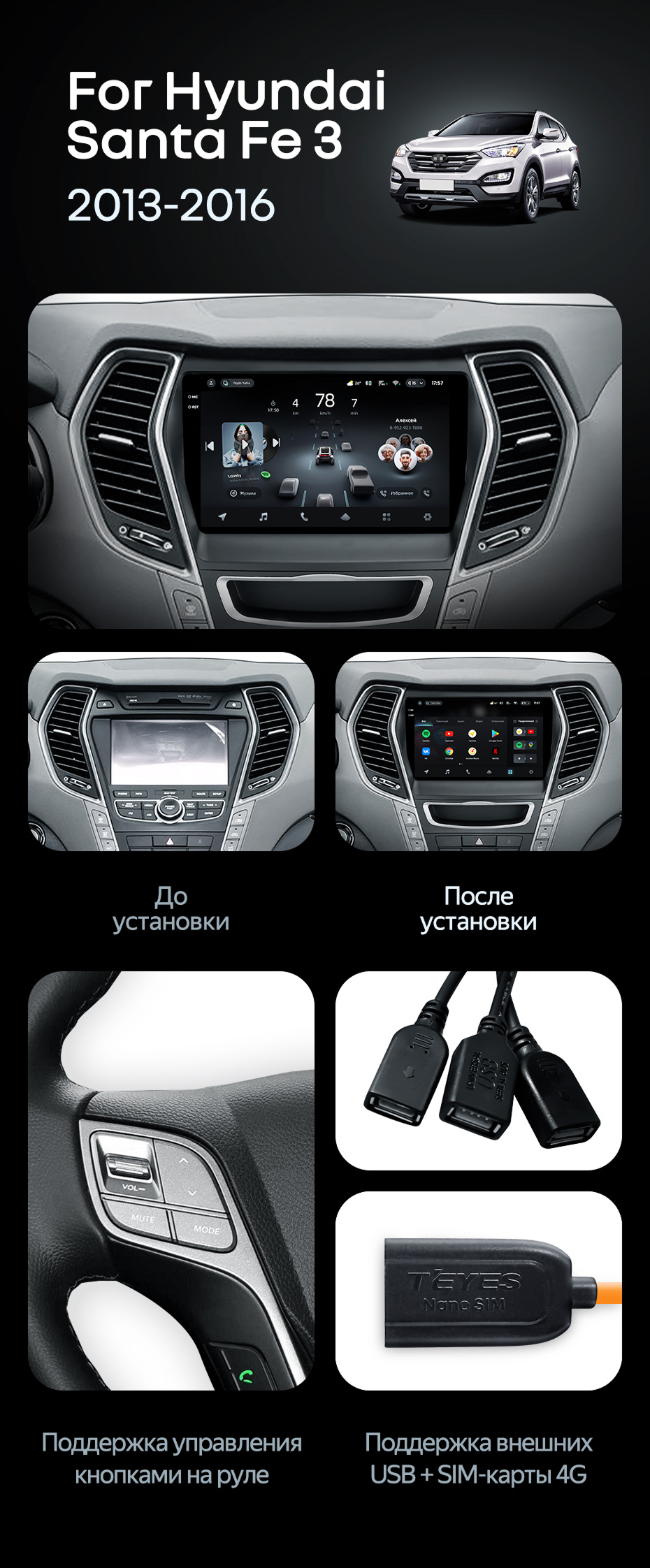Штатная магнитола Teyes CC4 Pro 8/128 Hyundai Santa Fe 3 (2013-2016) Тип-A - купить всего за 58 300 руб. в интернет-магазине в Калининграде Teyes.com.ru. ✓ Самый лучший выбор мультимедиа ✓ Лучшая замена штатному ГУ ✓ Тел. +7 (800) 775-31-74