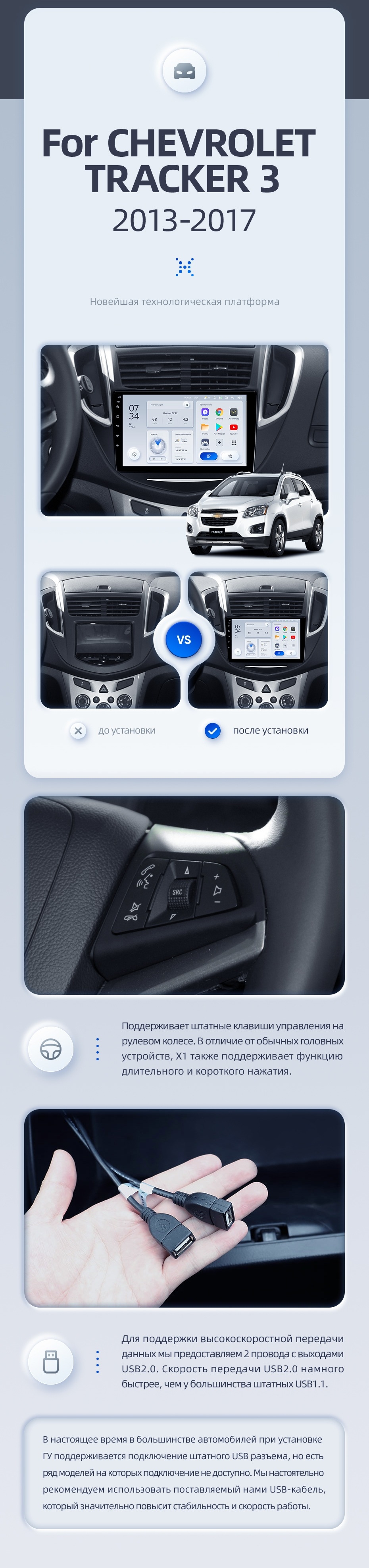 | USB | 3×USB 2.0 + USB 3.0 | Доп. аксессуары | Передняя/задняя AHD-камера, DVR-регистратор, TPMS, парковочный OBD, Type-C → HDMI |