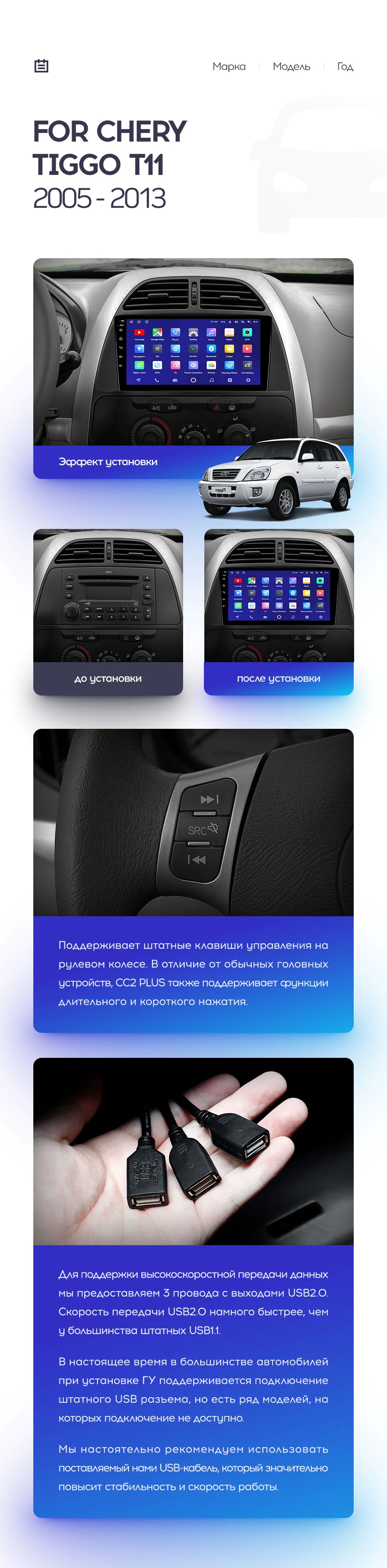 Полный комплект установки магнитолы Teyes с рамкой и проводкой можно выбрать в каталоге штатных магнитол Chery Tiggo T11 1 (2005-2013).