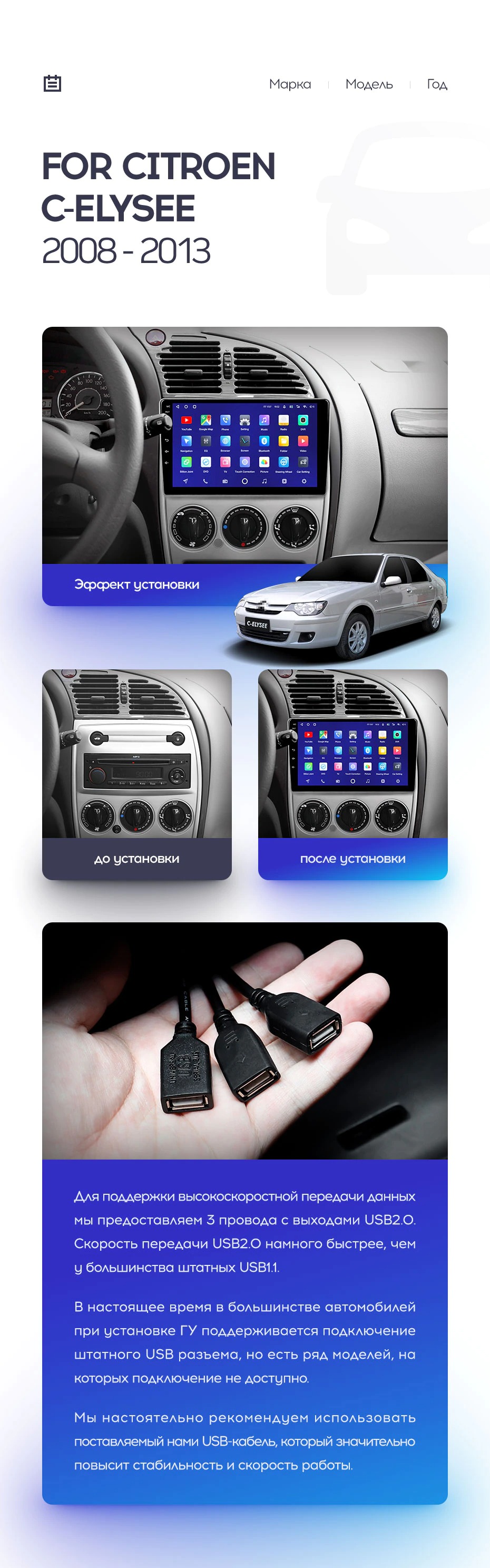 Полный комплект установки магнитолы Teyes с рамкой и проводкой можно выбрать в каталоге штатных магнитол Citroen C-Elysee (2008-2013).