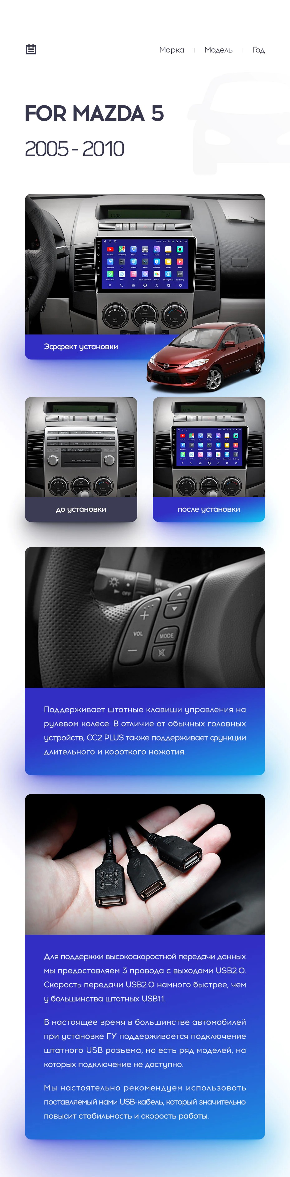 Полный комплект установки магнитолы Teyes с рамкой и проводкой можно выбрать в каталоге штатных магнитол Mazda 5 2 CR (2005-2010).