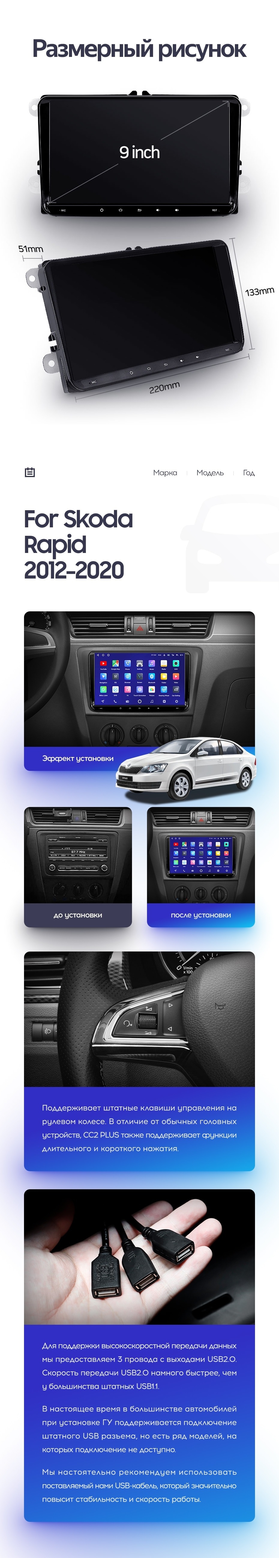 Полный комплект установки магнитолы Teyes с рамкой и проводкой можно выбрать в каталоге штатных магнитол Skoda Rapid NH3 NH1 (2012-2020).