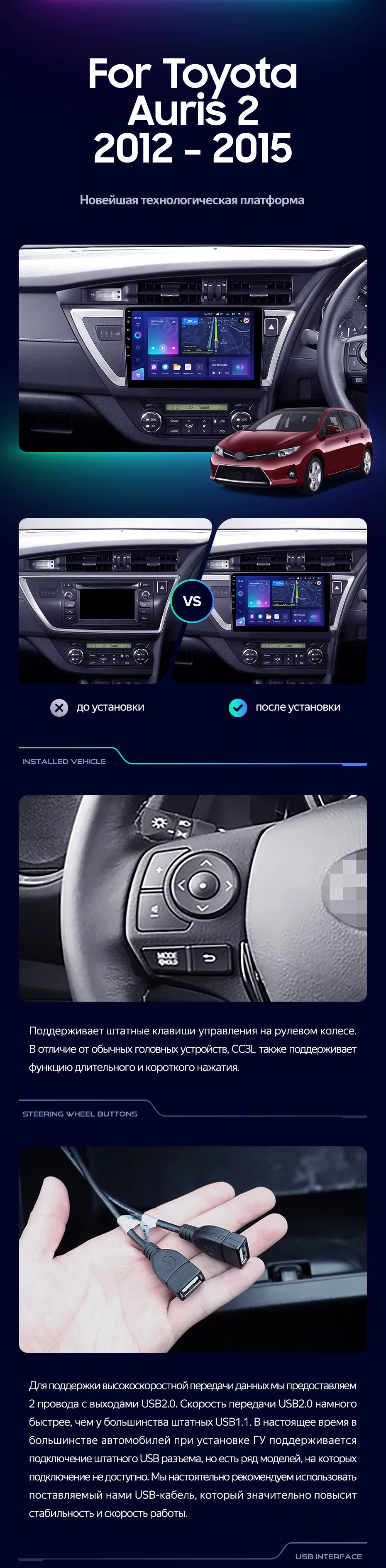 Готовый установочный комплект для магнитолы Toyota Auris 2 E180 (2012-2015) Правый руль 10 дюймов в штатное место, включает переходную рамку и проводку.